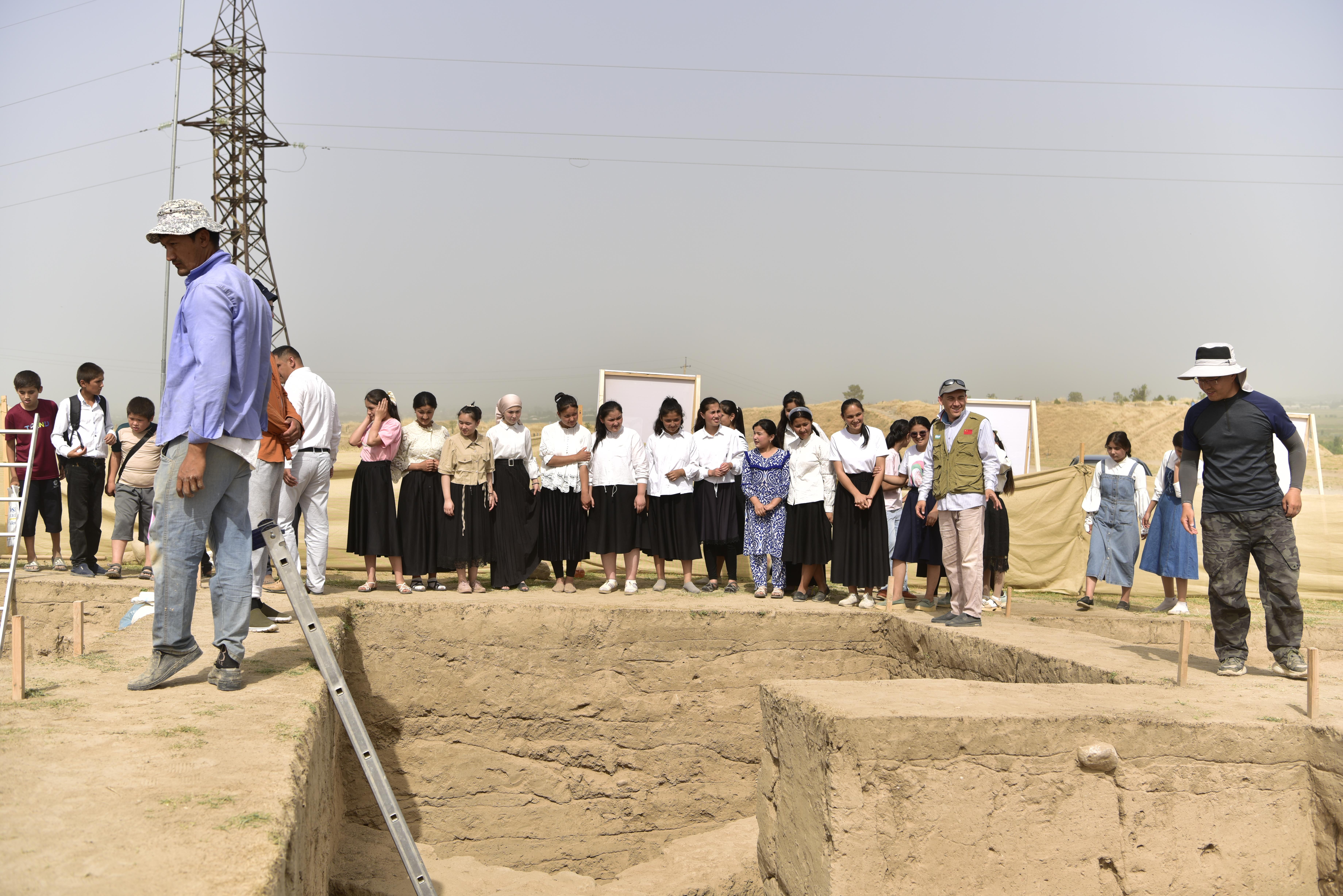 契纳尔特佩遗址由中国西北大学丝绸之路考古合作研究中心和乌兹别克斯坦撒马尔罕考古研究所组建的中乌联合考古队发掘。在发掘现场,学生们认真倾听中乌联合考古队员唐云鹏、Komiljon博士和Bakhodir博士关于契纳尔特佩遗址的介绍,详细了解了中乌两国考古学家联手从推土机的铲子下把契纳尔特佩遗址“抢回来”的故事,以及2019年以来中乌联合考古队在该遗址开展科学考古调查和发掘的过程和重要发现。学生们还在考古队员陈新儒的带领下,进入遗址发掘区,近距离参观遗迹和出土文物,感受丝绸之路辉煌历史的魅力。