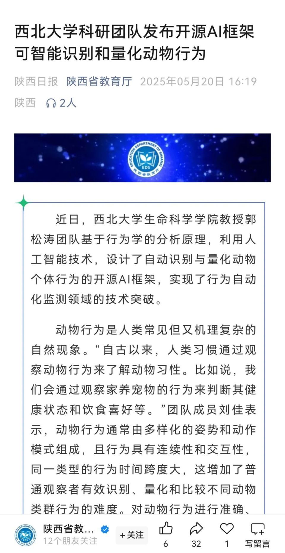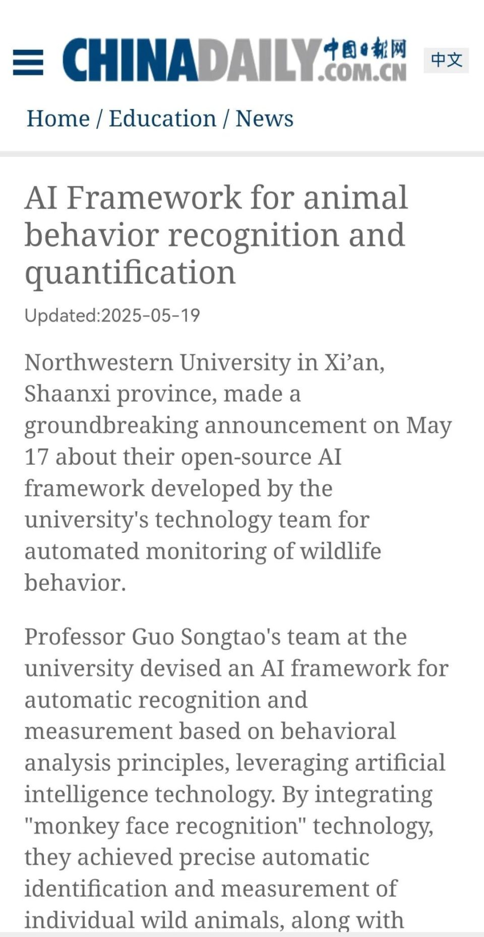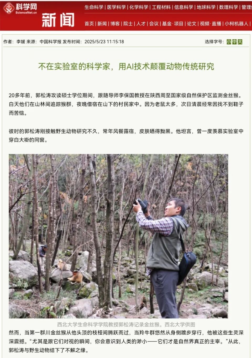 近日,此前研发“猴脸识别”技术的西北大学生命科学学院郭松涛团队再次发布重要成果——一种可以实现动物行为智能识别和自动量化的开源AI框架。科技日报、中国科学报、中国新闻社、中国日报等媒体纷纷关注报道。
