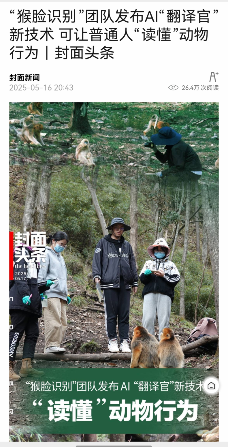 当框架能够精准捕捉动物们的“日常节奏”,为每一个动物个体建立行为档案,不仅为此后的科研建立数据库,也为普通人了解动物的内心世界提供了一个窗口。演示中,团队成员、硕士生王詹打开手机小程序,对准电脑屏幕上的一张猴子照片按下快门,不到5秒钟,结果就出来了。“它叫‘洋葱’,可信度85%。”刘洋说。随后的演示图像中,“洋葱”的整个身体被打上若干个点位标记,分析这些点位的运动规律,就能深度解析其全生命周期的行为意图。