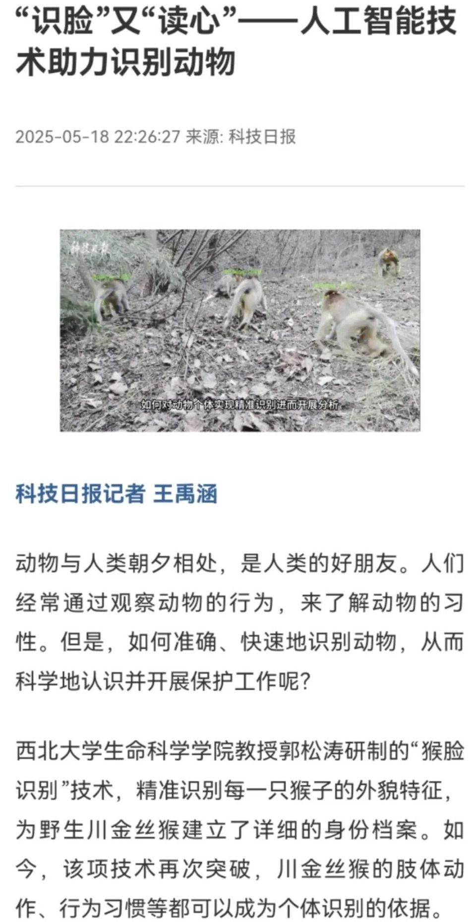 “我们所研究的群体数量较大,如何区分每一个个体,‘猴脸识别’技术就发挥了重要作用。并且,在分辨出个体的基础上,才能对其个体的行为识别进行连贯而系统的分析。”郭松涛把猴脸识别技术比做行为识别技术的铺垫。通过这两种技术的结合,研究人员能够自动化检测和测量野生动物全周期的行为特征。