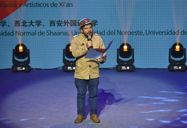 Mexican poet Manuel Baccerra delivers a speech on behalf of the Latin American and Caribbean poets at the opening ceremony of the 2025 International Youth Poetry Festival—Special Session for China-Latin American Countries, in Xi’an, Shaanxi province, on Sept 15, 2025. [Photo by Xue Bo/provided to chinadaily.com.cn]
