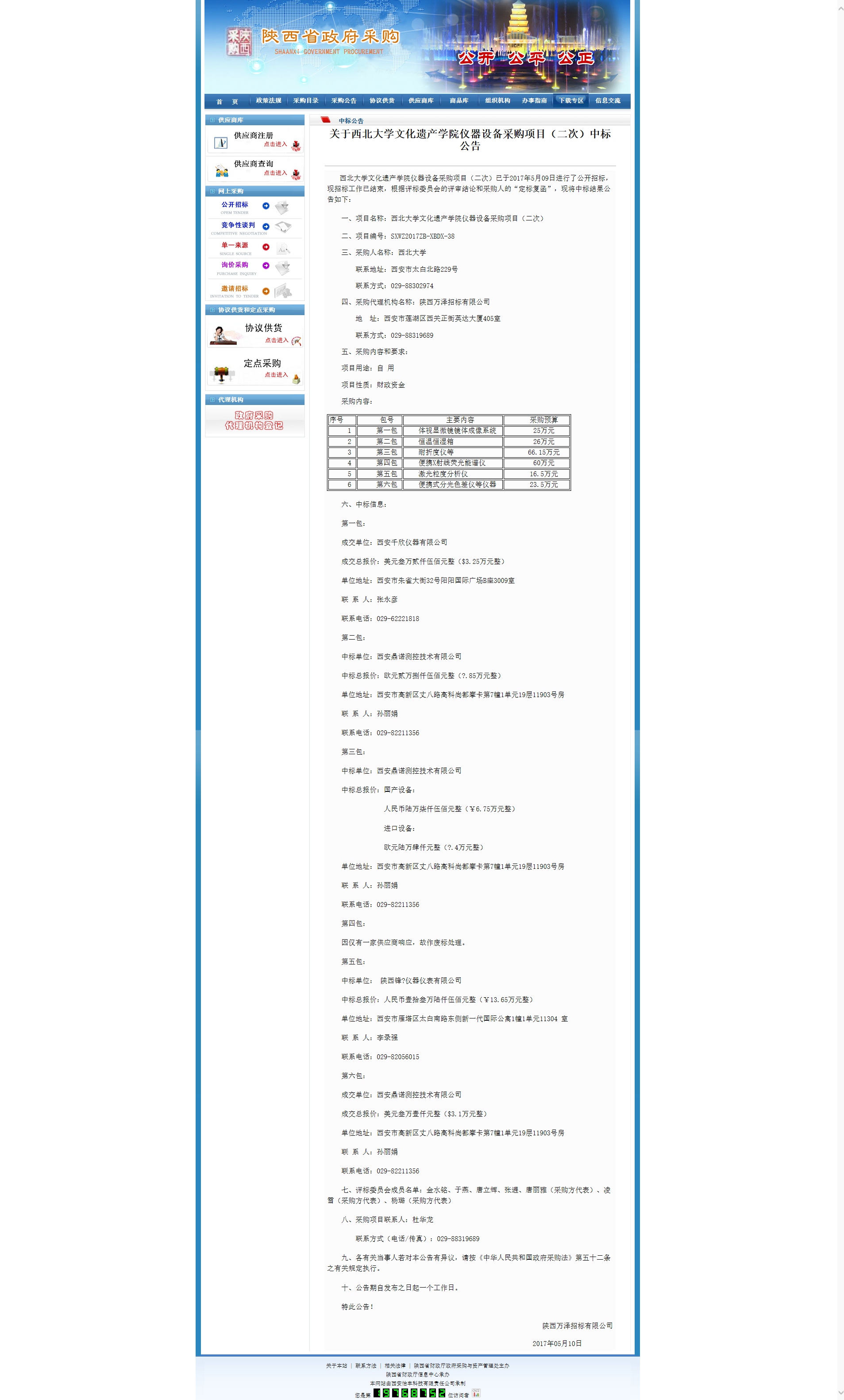 关于西北大学文化遗产学院仪器设备采购项目(二次)中标公告 作者: 编辑: 时间:2017-05-11 09:03 http://www.ccgp-shaanxi.gov.cn/zbxxs.jsp?NewsID=ZH170510141437US101028111214&ClassBID=C0002