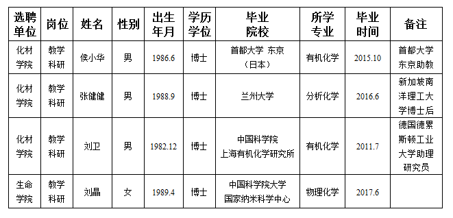 关于教学科研单位选聘教师情况的公示 作者: 编辑: 时间:2017-05-12 17:38 经用人单位推荐,人事处审查,学校教学督导及院系相关专家考核,我校拟确定下列人员来校工作。本着公平、公正、公开的原则,为保证我校选聘人员的质量,现将本次拟选聘人员基本情况公示如下: 各单位或个人如对上述人选存有疑问,可在2017年5月18日前以书面形式向人事处人事科反映。反映材料须实名提交,以便我处核实并反馈,我们将严格保密。(公示期结束后,如无异议,本人持三方协议、身份证、毕业生就业推荐表在人事科签订就业协议。) 联系电话:029-88308221 西北大学人事处 2017年5月12日