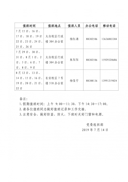党委组织部2019年暑假值班安排