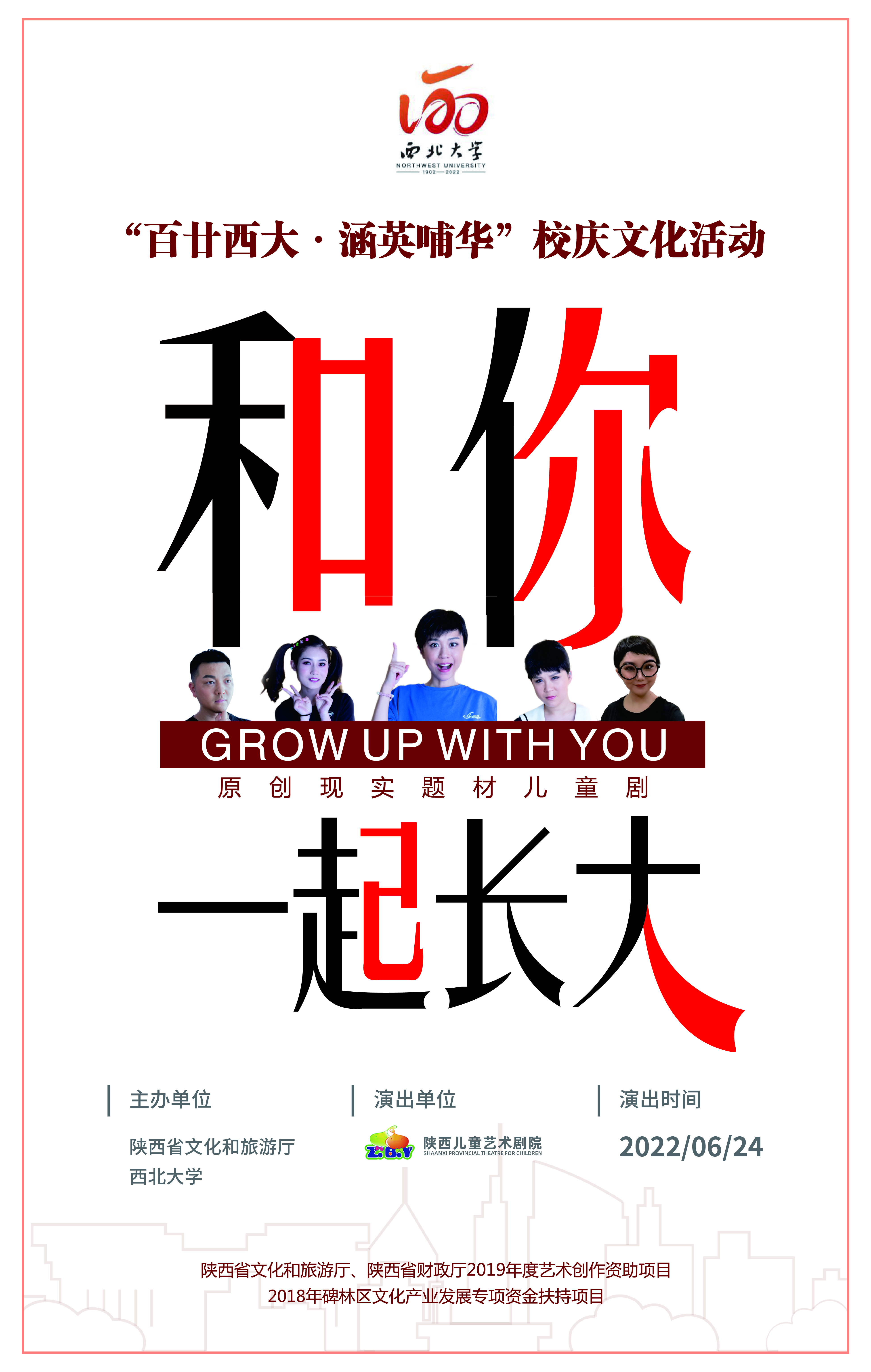 为庆祝西北大学建校120周年,丰富校园文化生活,关爱教职工子女身心健康发展,平衡教职工校园工作与家庭生活的关系,校工会联合陕西省文化和旅游厅邀请陕西儿童艺术剧院演出原创现实题材儿童剧《和你一起长大》,现将有关事项通知如下。