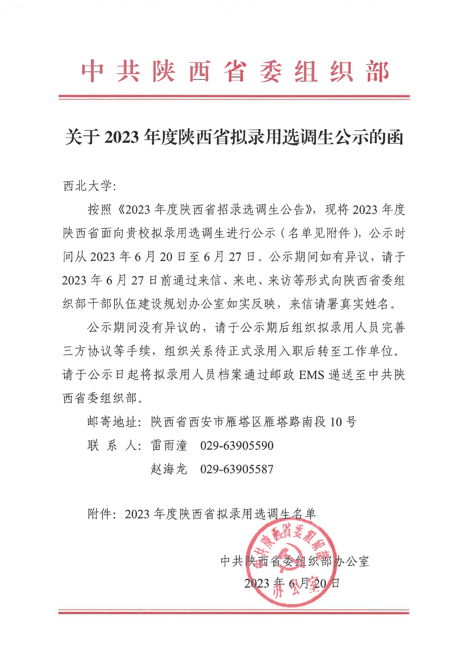 2023年度陕西省面向西北大学拟录用选调生名单公示