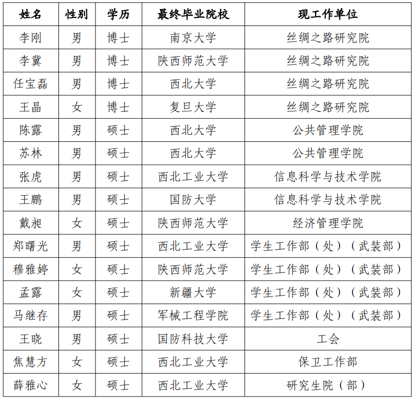 关于军事理论课教师选聘情况的公示 作者: 编辑:马继存 时间:2024-10-25 为进一步加强大学生军事理论课教学工作,根据《西北大学军事理论课教师选聘工作暂行办法》,军事教研室组织了军事理论课教师选聘。经资格审查、面试考核、综合考察,拟选聘下列人员为我校军事理论课教师。本着公平、公正、公开的原则,现将本次拟选聘人员基本情况公示如下: 各单位或个人如对上述人选存有疑问,可在2024年10月30日前以书面形式向武装部反映。反映材料须实名提交,以便我部核实并反馈,我们将严格保密。 联系电话:88308219 党委人民武装部 2024年10月25日