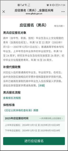 2025年我国征兵工作实行一年“两次征兵两次退役”。从2024年12月1日起,全国征兵网报名窗口已经正式开通,现将我校2025年下半年征兵工作有关事项通知如下: