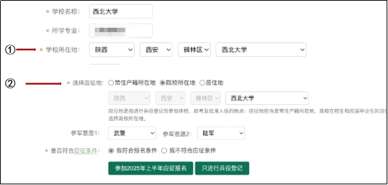1.在报名过程中,“学校所在地”“选择应征地”两个内容,三校区均统一选择为:陕西西安碑林区西北大学。