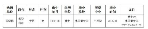 经用人单位推荐,人力资源部审查,学校教学督导及院系相关专家考核,我校拟确定下列人员来校工作。本着公平、公正、公开的原则,现将本次拟选聘人员基本情况公示如下: