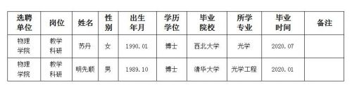 经用人单位推荐,人力资源部审查,学校教学督导及院系相关专家考核,我校拟确定下列人员来校工作。本着公平、公正、公开的原则,现将本次拟选聘人员基本情况公示如下: