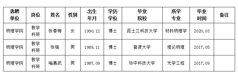 经用人单位推荐,人力资源部审查,学校教学督导及院系相关专家考核,我校拟确定下列人员来校工作。本着公平、公正、公开的原则,现将本次拟选聘人员基本情况公示如下: