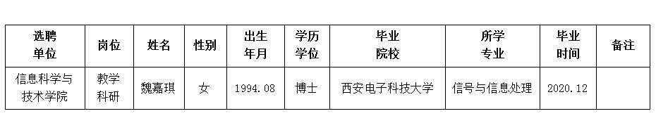 经用人单位推荐,人力资源部审查,学校教学督导及院系相关专家考核,我校拟确定下列人员来校工作。本着公平、公正、公开的原则,现将本次拟选聘人员基本情况公示如下: