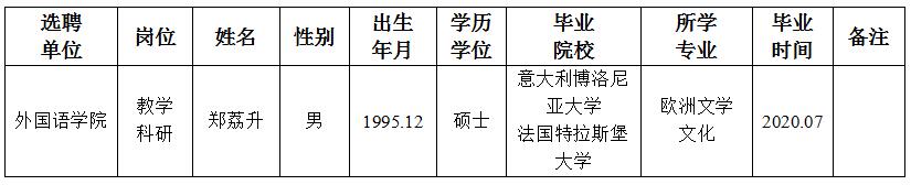 经用人单位及教学督导考核、学校研究,拟同意选聘下列人员来校工作,其聘任关系为A类人事代理。本着公平、公正、公开的原则,现将拟选聘人员基本情况公示如下: