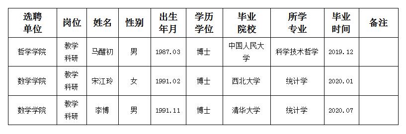 经用人单位推荐,人力资源部审查,学校教学督导及院系相关专家考核,我校拟确定下列人员来校工作。本着公平、公正、公开的原则,现将本次拟选聘人员基本情况公示如下: