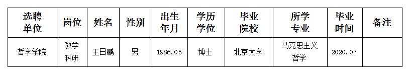 经用人单位推荐,人力资源部审查,学校教学督导及院系相关专家考核,我校拟确定下列人员来校工作。本着公平、公正、公开的原则,现将本次拟选聘人员基本情况公示如下:
