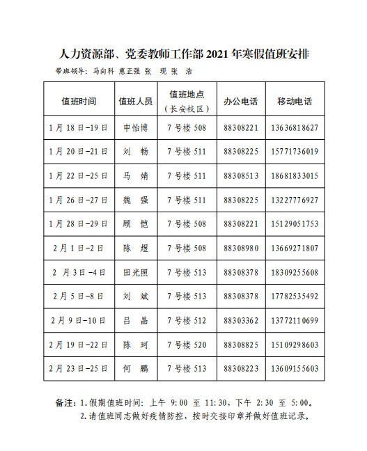 人力资源部、党委教师工作部2021年寒假值班安排