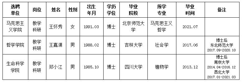 经用人单位推荐,人力资源部审查,学校教学督导及院系相关专家考核,我校拟确定下列人员来校工作。本着公平、公正、公开的原则,现将本次拟选聘人员基本情况公示如下: