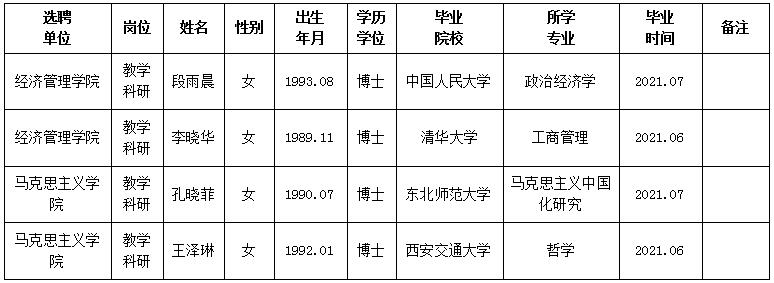 经用人单位推荐,人力资源部审查,学校教学督导及院系相关专家考核,我校拟确定下列人员来校工作。本着公平、公正、公开的原则,现将本次拟选聘人员基本情况公示如下: