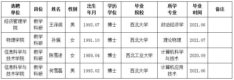 经用人单位推荐,人力资源部审查,学校教学督导及院系相关专家考核,我校拟确定下列人员来校工作。本着公平、公正、公开的原则,现将本次拟选聘人员基本情况公示如下:
