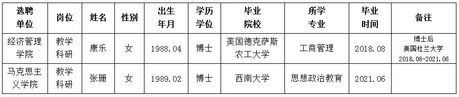 经用人单位推荐,人力资源部审查,学校教学督导及院系相关专家考核,我校拟确定下列人员来校工作。本着公平、公正、公开的原则,现将本次拟选聘人员基本情况公示如下: