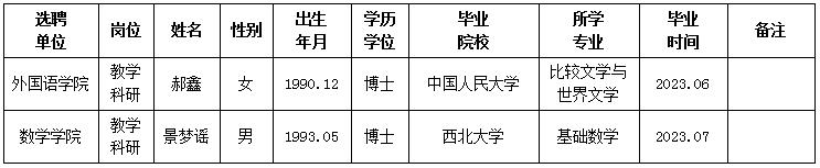 经用人单位推荐,人力资源部审查,学校教学督导及院系相关专家考核,我校拟确定下列人员来校工作。本着公平、公正、公开的原则,现将本次拟选聘人员基本情况公示如下: