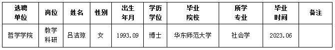 经用人单位推荐,人力资源部审查,学校教学督导及院系相关专家考核,我校拟确定下列人员来校工作。本着公平、公正、公开的原则,现将本次拟选聘人员基本情况公示如下: