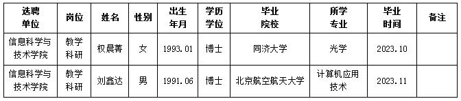 经用人单位推荐,人力资源部审查,学校教学督导及院系相关专家考核,我校拟确定下列人员来校工作。本着公平、公正、公开的原则,现将本次拟选聘人员基本情况公示如下: