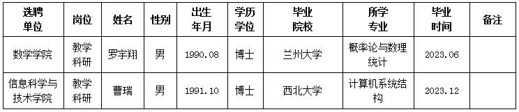 经用人单位推荐,人力资源部审查,学校教学督导及院系相关专家考核,我校拟确定下列人员来校工作。本着公平、公正、公开的原则,现将本次拟选聘人员基本情况公示如下: