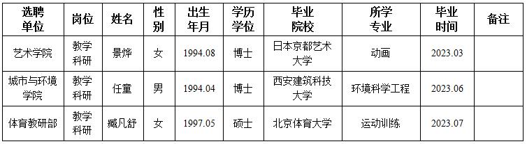 经用人单位及教学督导考核、学校研究,拟同意选聘下列人员来校工作,其聘任关系为人事代理。本着公平、公正、公开的原则,现将拟选聘人员基本情况公示如下: