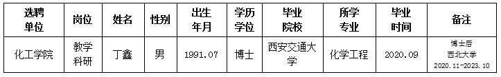 经用人单位推荐,人力资源部审查,学校教学督导及院系相关专家考核,我校拟确定下列人员来校工作。本着公平、公正、公开的原则,现将本次拟选聘人员基本情况公示如下: