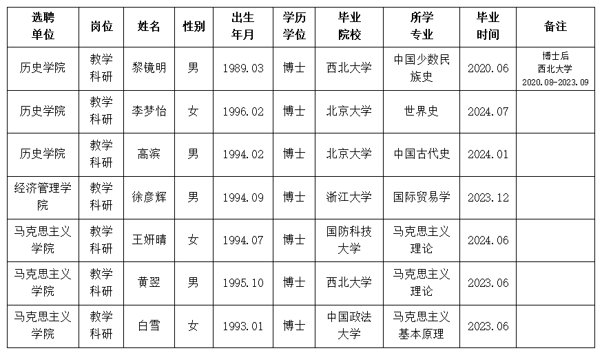 经用人单位推荐,人力资源部审查,学校教学督导及院系相关专家考核,我校拟确定下列人员来校工作。本着公平、公正、公开的原则,现将本次拟选聘人员基本情况公示如下: