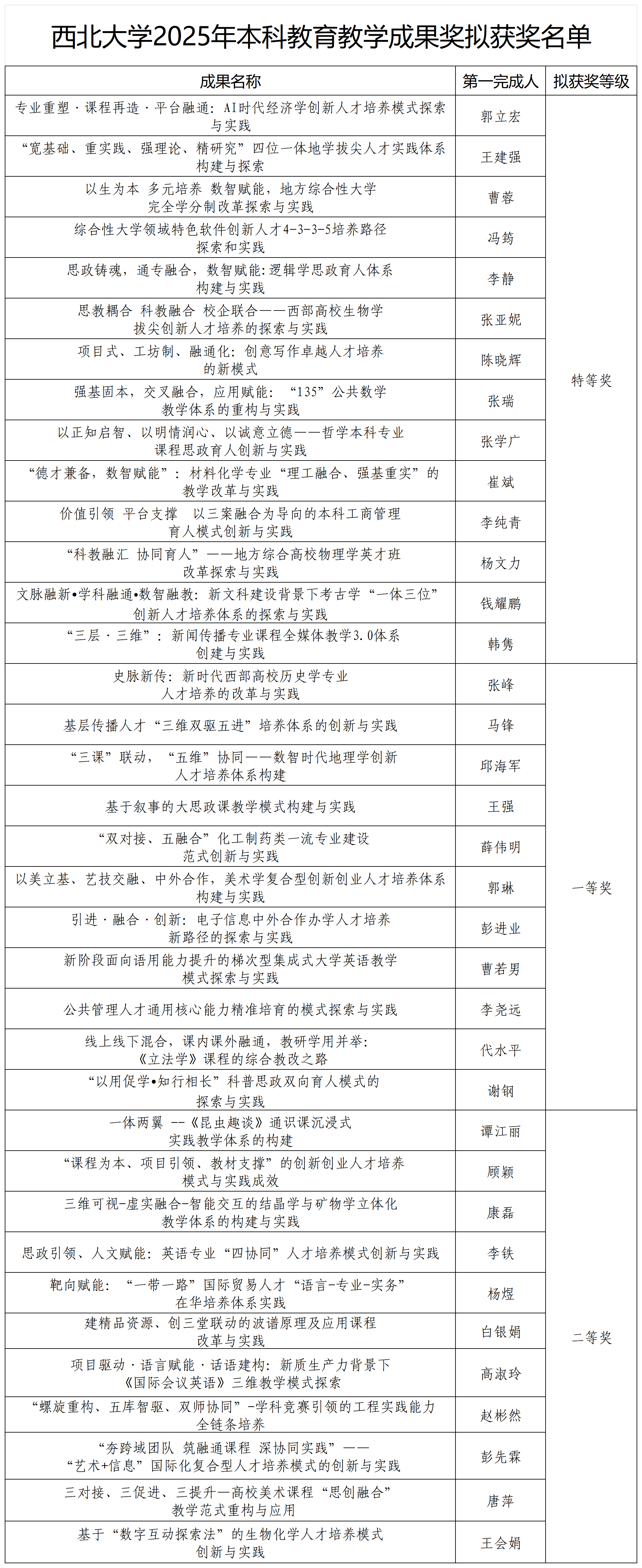 根据《西北大学关于开展2025年本科教育教学成果奖评选工作的通知》(西大教〔2025〕19号)要求,经个人申报、单位推荐与专家评审,拟确定“专业重塑·课程再造·平台融通:AI时代经济学创新人才培养模式探索与实践”等14项成果获特等奖,“史脉新传:新时代西部高校历史学专业人才培养的改革与实践”等11项成果获一等奖,“一体两翼-《昆虫趣谈》通识课沉浸式实践教学体系构建”等11项成果获二等奖。同时,将依序推荐参加陕西省2025年本科教育教学成果奖评选。现将拟获奖名单予以公示,公示期为2025年9月8日-12日。公示期任何单位或个人有异议,请实名以书面形式向教务处反映。