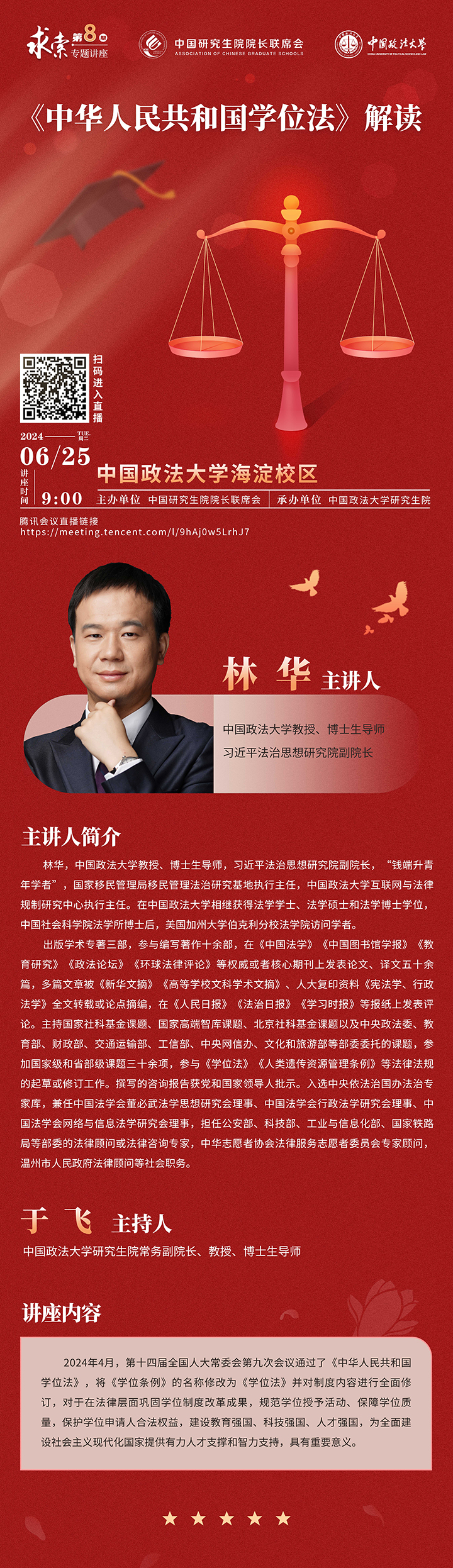 中国研究生院院长联席会于6月25日举办第8期“求索”专题讲座,主讲人为中国政法大学教授、博士生导师,习近平法治思想研究院副院长林华,讲座题目是《<中华人民共和国学位法>解读》,本期专题讲座由中国政法大学研究生院承办,采取腾讯会议直播的形式进行,直播时间:6月25日上午9:00,直播链接:https://meeting.tencent.com/l/9hAj0w5LrhJ7