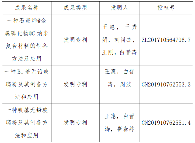 “①一种石墨烯@金属磷化物@C纳米复合材料的制备方法及应用;②一种Bi基无铅玻璃粉及其制备方法和应用(受理);③一种钒基无铅玻璃粉及其制备方法和应用(受理)”。