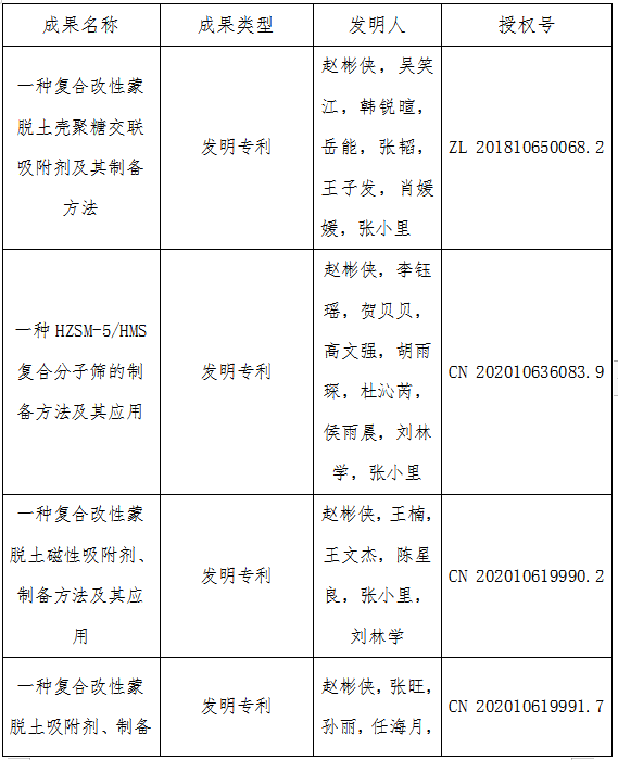“1.一种复合改性蒙脱土壳聚糖交联吸附剂及其制备方法;2.一种HZSM-5/HMS复合分子筛的制备方法及其应用(受理);3.一种复合改性蒙脱土磁性吸附剂、制备方法及其应用(受理);4一种复合改性蒙脱土吸附剂、制备方法及其应用(受理)”。