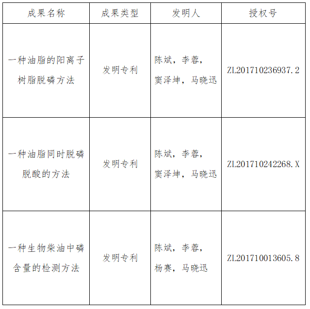 “①一种油脂的阳离子树脂脱磷方法②一种油脂同时脱磷脱酸的方法③一种生物柴油中磷含量的检测方法”。