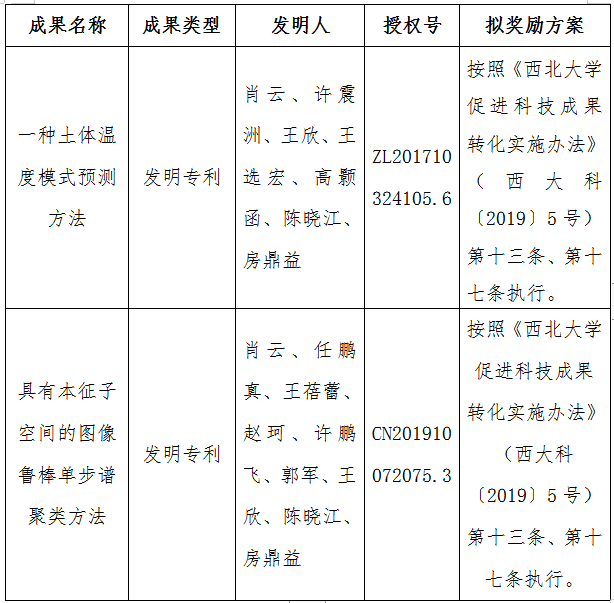 按照《西北大学促进科技成果转化实施办法》(西大科〔2019〕5号)相关规定,拟对我校信息科学与技术学院肖云教授作为成果负责人的2项发明专利权实施普通许可,现将相关信息公示如下: