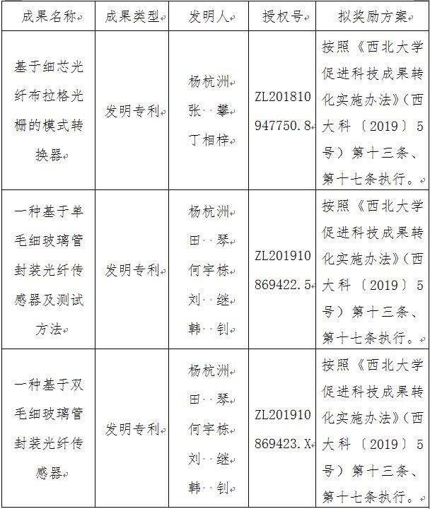 按照《西北大学促进科技成果转化实施办法》(西大科〔2019〕5号)相关规定,拟对我校物理学院杨杭洲教授作为成果负责人的3项发明专利权实施转化,现将相关信息公示如下: