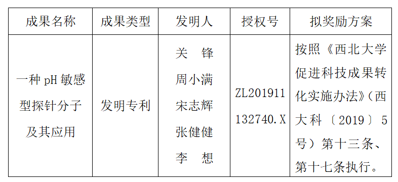 按照《西北大学促进科技成果转化实施办法》(西大科〔2019〕5号)相关规定,拟对我校生命科学学院关锋教授作为成果负责人的1项发明专利权实施转化,现将相关信息公示如下: