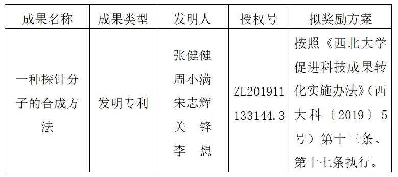 按照《西北大学促进科技成果转化实施办法》(西大科〔2019〕5号)相关规定,拟对我校化学与材料科学学院张健健副教授作为成果负责人的1项发明专利权实施转化,现将相关信息公示如下: