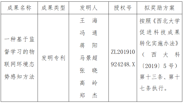 按照《西北大学促进科技成果转化实施办法》(西大科〔2019〕5号)相关规定,拟对我校信息科学与技术学院王海副教授作为成果负责人的1项发明专利权实施转化,现将相关信息公示如下: