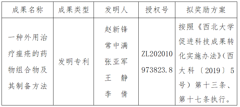 按照《西北大学促进科技成果转化实施办法》(西大科〔2019〕5号)相关规定,拟对我校生命科学学院赵新锋教授作为成果负责人的1项发明专利权实施转化,现将相关信息公示如下: