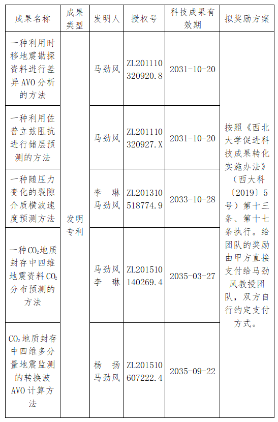 按照《西北大学促进科技成果转化实施办法》(西大科〔2019〕5号)相关规定,经科技成果转化工作小组审议,校长办公会审定通过,拟对我校地质学系马劲风教授作为成果负责人的5项发明专利权实施普通许可,现将相关信息公示如下: