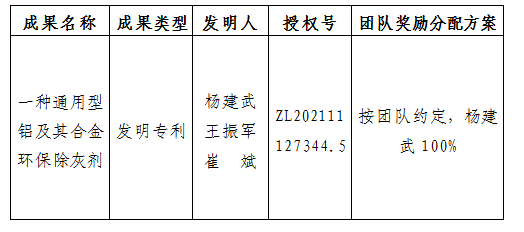 按照《西北大学促进科技成果转化实施办法》(西大科〔2019〕5号)相关规定,拟对我校化工学院杨建武老师作为成果负责人的1项发明专利权实施转化,现将相关信息公示如下: