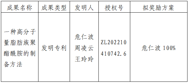 按照《西北大学促进科技成果转化实施办法》(西大科〔2019〕5号)相关规定,拟对我校化工学院危仁波教授作为成果负责人的1项发明专利权实施转化,现将相关信息公示如下: