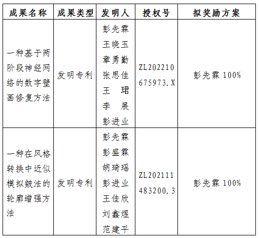 按照《西北大学促进科技成果转化实施办法》(西大科〔2019〕5号)相关规定,拟对我校艺术学院彭先霖老师作为成果负责人的2项发明专利权实施转化,现将相关信息公示如下: