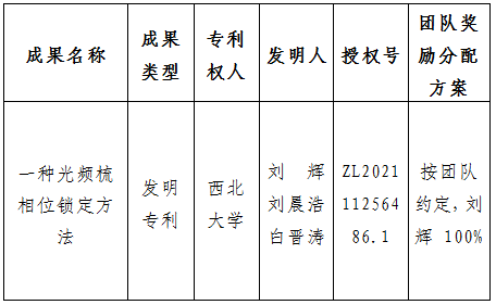 按照《西北大学促进科技成果转化实施办法》(西大科〔2019〕5号)相关规定,拟对我校光子学与光子技术研究所刘辉副教授作为成果负责人的1项发明专利权实施转化,现将相关信息公示如下: