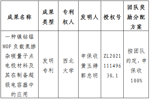 按照《西北大学促进科技成果转化实施办法》(西大科〔2019〕5号)相关规定,拟对我校城市与环境学院申保收副教授作为成果负责人的1项发明专利权实施转化,现将相关信息公示如下: