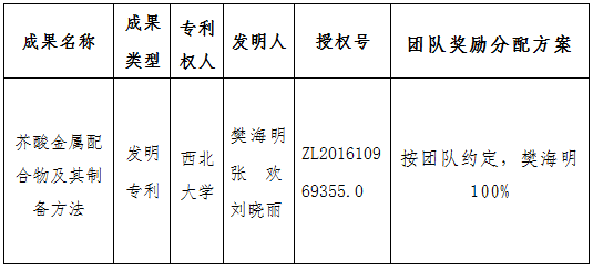 按照《西北大学促进科技成果转化实施办法》(西大科〔2019〕5号)相关规定,经科技成果转化工作小组审议,校长办公会审定通过,拟对我校化学与材料科学学院樊海明教授作为成果负责人的1项发明专利权实施以作价入股结合现金支付方式转让,现将相关信息公示如下:
